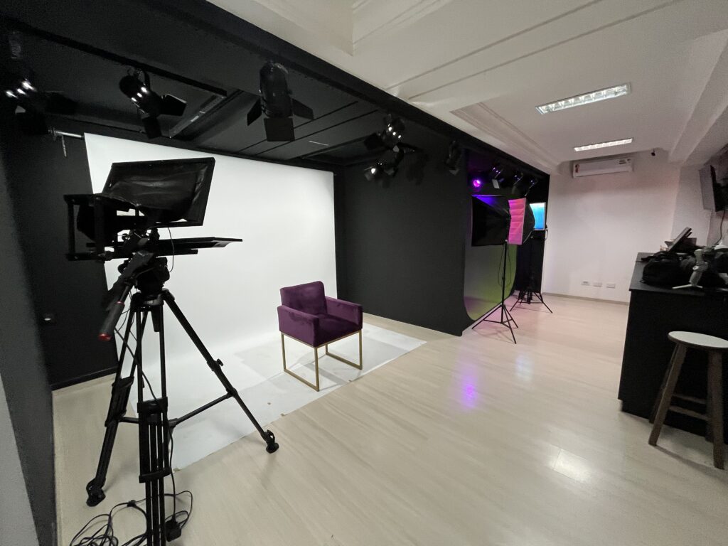 Estúdio fundo infinito e chroma key, prontos para produções versáteis e de alto padrão. Equipados com luzes RGB instaladas, iluminação de apoio com softbox, monitor de retorno no estúdio croma e teleprompter, tudo pensado para entregar qualidade de cinema e facilitar cada etapa da gravação.